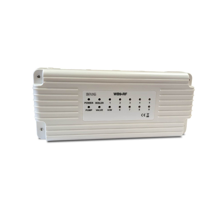 The Snug RF Wireless Wiring Centre is a 9 zone wireless wiring centre and is designed to work with SnugStat RF Wireless Wi-Fi thermostats, giving installers a totally wireless solution. It provides central switching and is therefore ideally situated next to the underfloor heating manifold. 9 zones can be controlled as well as providing an output for a hot water cylinder. At the same time the WB9-RF offers the ability to operate a boiler or other heat source through a volt free output with changeover contacts, which gives you both a heat on signal and a heat off signal. Up to 9 actuators can be connected to each zone.