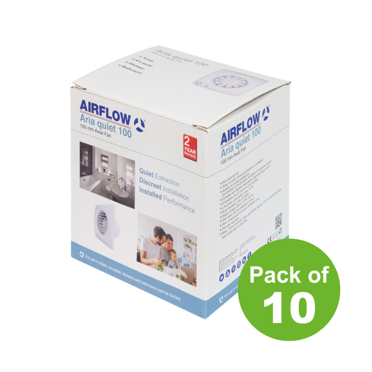 (PACK OF 10) The Aria Quiet 100B is an unobtrusive, cost-effective, and easy-to-install extractor fan. The neat and compact design looks subtle when installed, and the fan operates quietly, so it's easy on the ears and the eyes.
