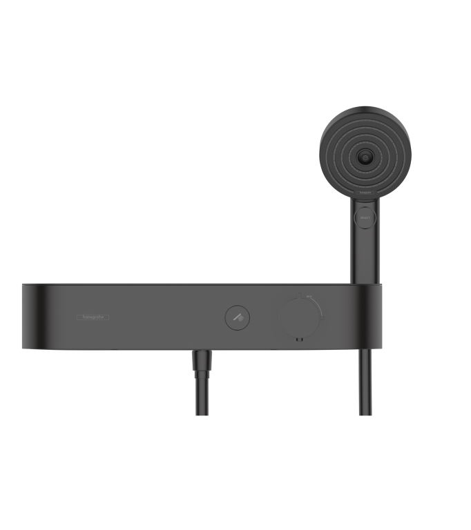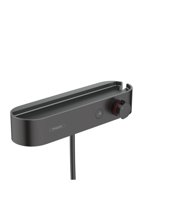designed to run 1 outlet, temperature and volume control, Select push-button on / off control for 1 outlet, hand shower holder integrated in the shelf, CoolContact thermostat: Prevents the housing from heating up, making showering even safer, Maximum flow rate (at 3 bar): 16.3 l/min , Min. operating pressure: 1 bar , Max. operating pressure: 10 bar , safety stop at 40°C, Maximum temperature can be adjusted on installation, with isolated water conduction, Non-return valve, shelf made of plastic, Shelf colour: graphite , Material handles: plastic , Centre distance: 150 mm ± 12 mm , Connection type: S connections, ½" , dirt filter included, thermostat is delivered with button hand shower, if running with a pump, please specify a universal (negative head) pump, Noise class: I